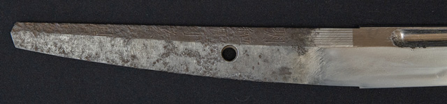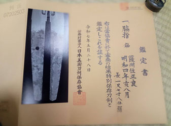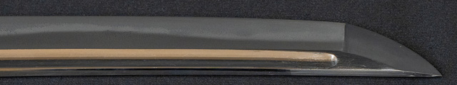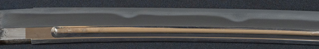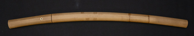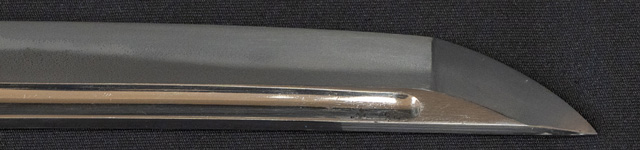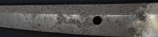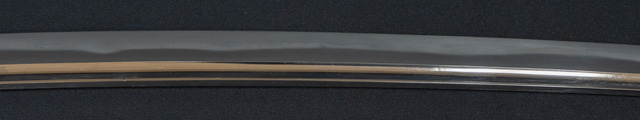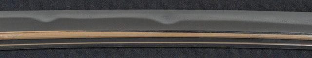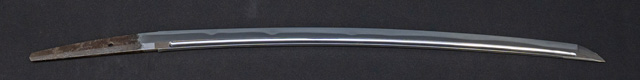 | 刀長53.8cm(1尺7寸7分5厘) 反り 1.2(4分) 元幅 2.80cm 先幅 2.29cm 元重7.3mm 先重5.4mm 刀身重量裸身410g 茎生 目釘穴1 刃文乱刃 |