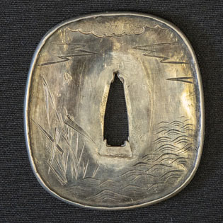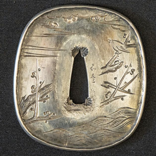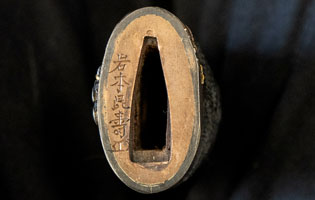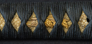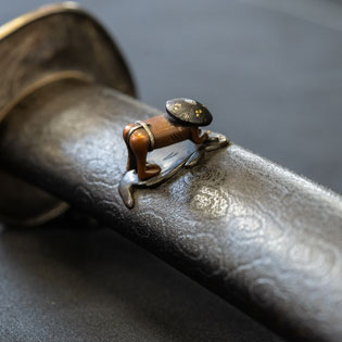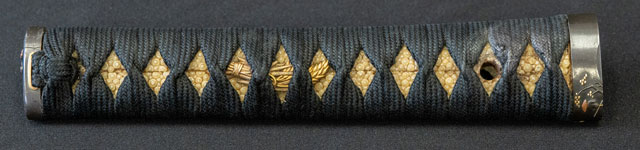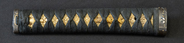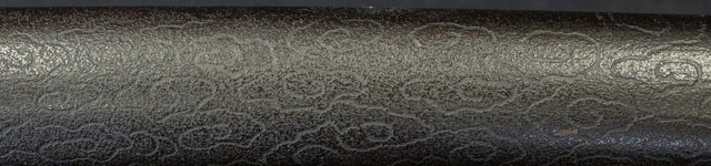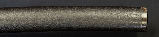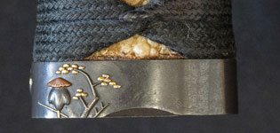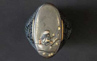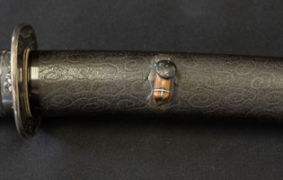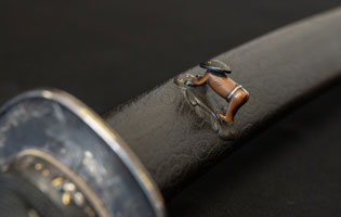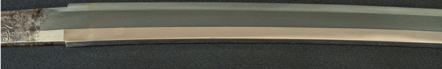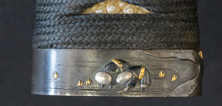 刃紋直刃小沸出来・地金小杢肌良く錬る。拵鞘の栗型か船頭がなまずに乗っている図が良く生きていて思わず笑ってしまう名品である。