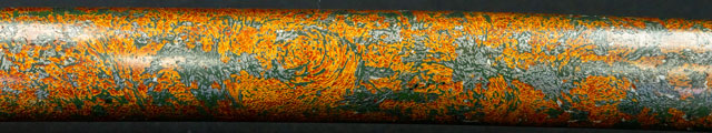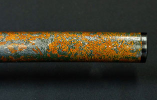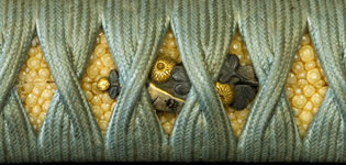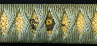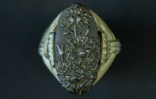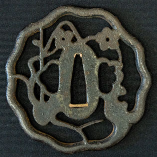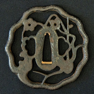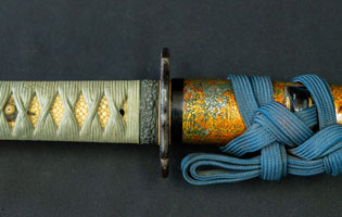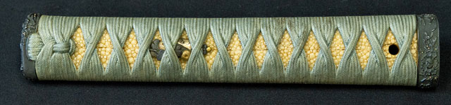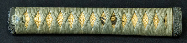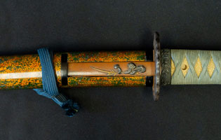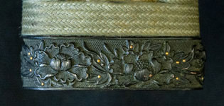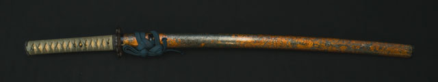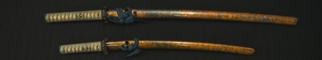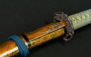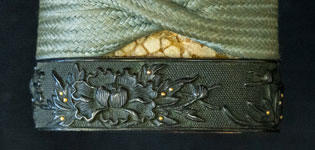 柄は赤胴美濃彫牡丹の図。鐔は肥後梅透かし。目貫は金色絵秋草の図で鞘は金変り塗でまとめてある。大小拵え入り。