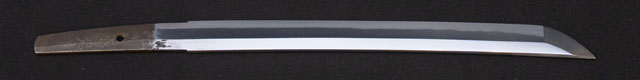 | 刀長 28.2cm(0尺9寸3分) 反り 0.2cm(0分9厘) 元幅 2.39cm 先幅 2.31cm 元重 5.4mm 先重 5.4mm 刀身重量裸身250g 鞘を払って-g 茎 生 目釘穴 1 刃文 小互ノ目乱 |