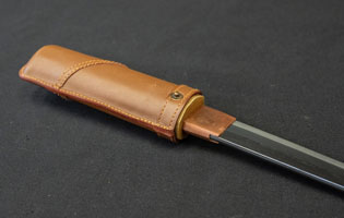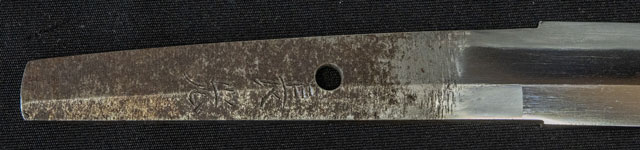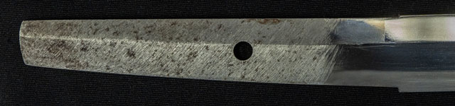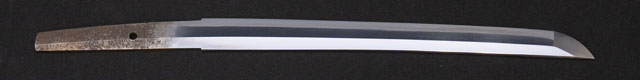 | 刀長 28.1cm(0尺9寸3分) 反り 0.2cm(0分9厘) 元幅 2.46cm 先幅 2.12cm 元重 5.3mm 先重 5.0mm 刀身重量裸身230g 鞘を払って-g 茎 生 目釘穴 1 刃文 小互ノ目乱 |